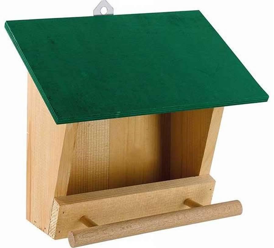 Деревянная кормушка с крышей из влагостойкой фанеры. Детали кормушки не рекомендуется пропитывать антисептиками даже для защиты древесины, химические вещества могут оказаться вредными для здоровья птиц. Покрытые лаком кормушки выглядят более эстетично, но птицы станут прилетать к ним, когда полностью выветрится запах.