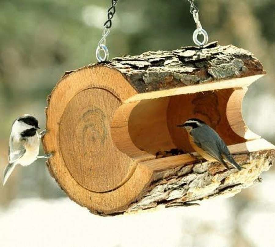 Кормушка из дерева для птиц красива, но при этом выглядит естественно и экологично. Преимущество такой кормушки в том, что она доступна для мелких птиц.