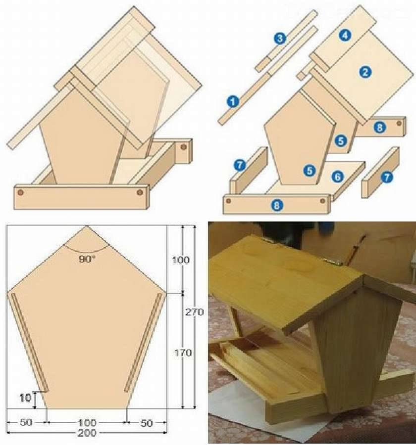Кормушки из дерева делаются в основном по чертежам и схемам, на которых указываются размеры и порядок сборки изделия. Ниже посмотрите и возьмите на заметку несколько таких интересных проектов, которые не представляют сложностей даже для детей.