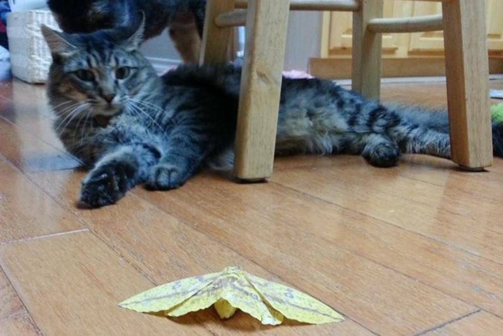 Что в этом хорошего, так это то, что мотылек, по-видимому, имеет редкий желтый оттенок. Итак, кот представил своего хозяина насекомому. К сожалению, похоже, что мотылек мертв.