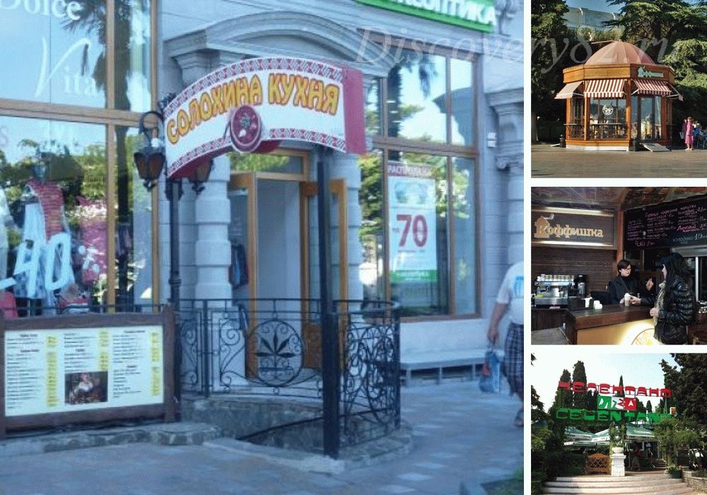 1. Столовые. Да-да, те самые столовые самообслуживания, которые пользуются спросом в сезон и вне его. Названия «По-домашнему» на Пушкинской 23/14, « У Солохи», что на Набережной не балуют выбором, зато есть свежие салаты, приятные детские супчики, масса гарниров к мясу, рыбе и огромный ассортимент выпечки, сладостей. Есть знаменитая «Ялтинская столовая», где предлагают отведать вкуснейшие шашлыки и есть детское меню. Средний чек в 200 рублей за двоих.