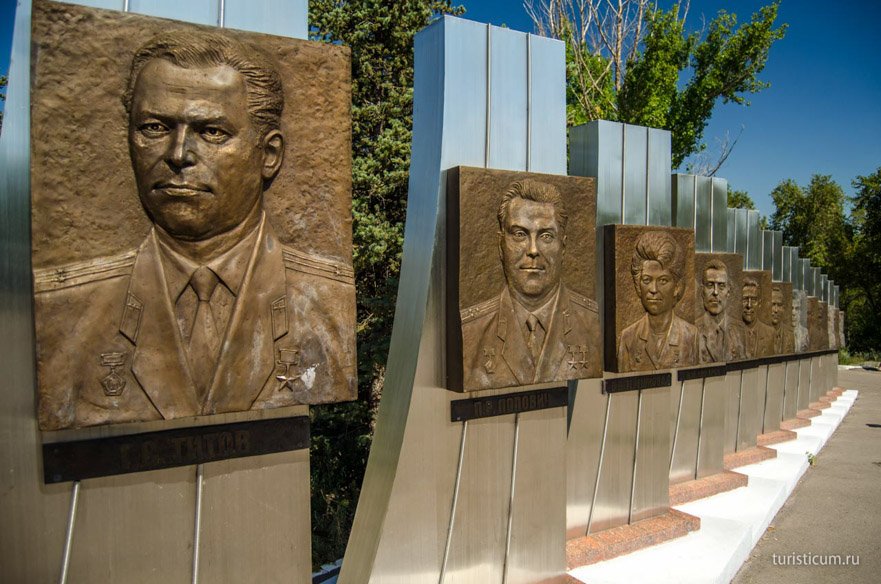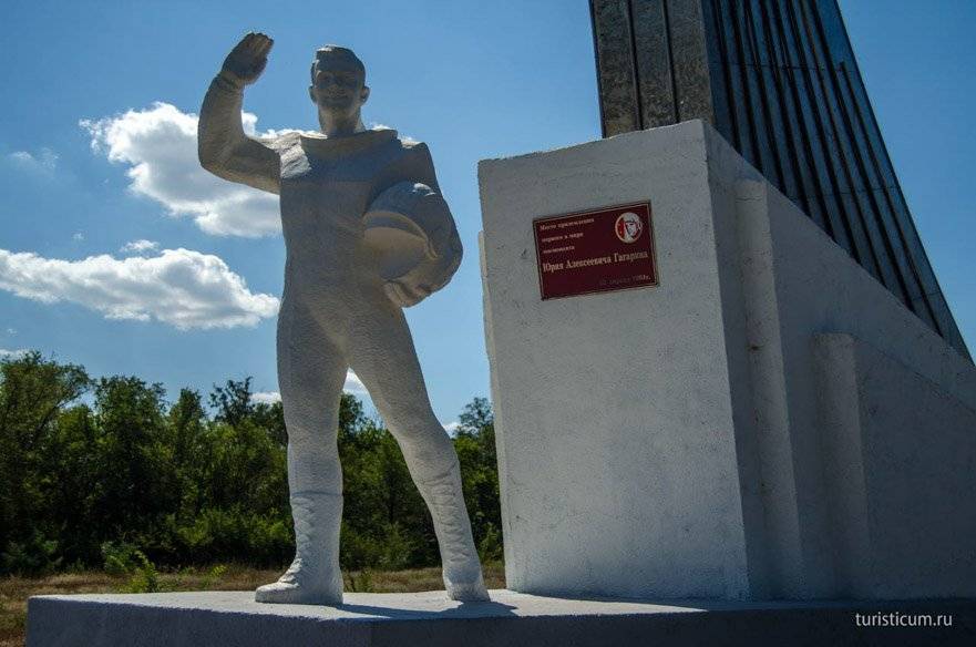Вот мы и на месте. Гагаринское поле – так называют это место, куда 12 апреля 1961 года приземлился первый советский космонавт Юрий Алексеевич Гагарин. Место это было засекречено, но людская молва быстро разнесла его местоположение и через четыре года здесь появился монумент, уменьшенная копия обелиска с ВДНХ. В 1981 году здесь появился памятник Гагарину, а в 2011 двенадцать стел с именами знаменитых космонавтом. Еще рядом установлен монумент с барельефами Циолковского и Королева, а рядом с самим Гагариным спускаемый модуль, правда не “Восток”, в котором спускался наш первый космонавт, а “фотон”, который раньше стоял на Соколовой горе в парке Победы в Саратове.