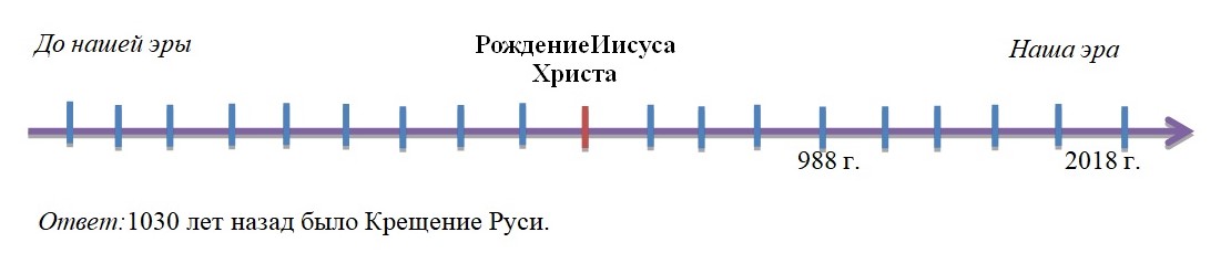 Решение: необходимо отметить 988 г. на ленте времени, затем текущий год. Обе даты относятся к нашей эре, чтобы узнать сколько лет прошло от 988 г. до 2018 г., необходимо из второго числа вычесть первое: 2018-988 = 1030.