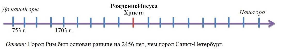 Решение: события на исторической линии отмечаются последовательно, начиная слева. Поэтому все даты, расположенные правее от выбранной точки, случались позже и наоборот. Соответственно 753 г. до н.э. был раньше, чем 1703 г. н.э. Год основания Рима относится к периоду до нашей эры, а дата основания Санкт-Петербурга – к периоду нашей эры. Оба события находятся в различных периодах, поэтому эти два числа нужно прибавить друг к другу: 1703+753=2456.