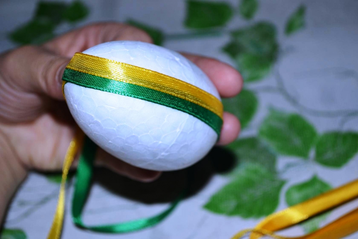 Обычно для такой цели применяют магазинные заготовки яиц из пенопласта или пластика. Их обматывают ленточками, перекрещивая в верхней точке и закрепляя горячим клеем. Декорируют поделку бусинами, пайетками, бисером.
