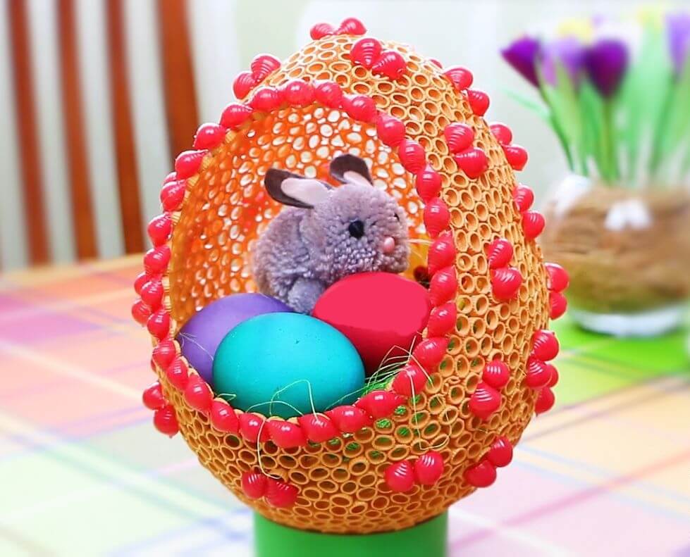 Для детей постарше можно сделать и что-нибудь посложнее. Одним из вариантов является корзинка из газетных трубочек, наполненная пасхальными яйцами. Все, что нужно, это газета, карандаш, клей и поделка пасхальных яиц.