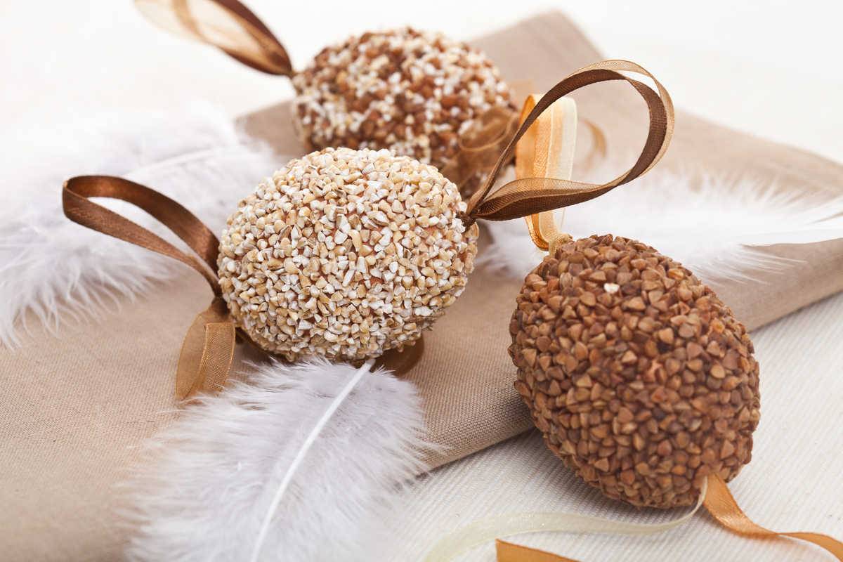 В качестве основы берут яйцо из пенопласта или скорлупу от обычного куриного яйца. Заготовку смазывают клеем ПВА, а потом аккуратными рядами оклеивают фасолью, гречкой, рисом, горохом или посыпают манкой, после окрашивают.
