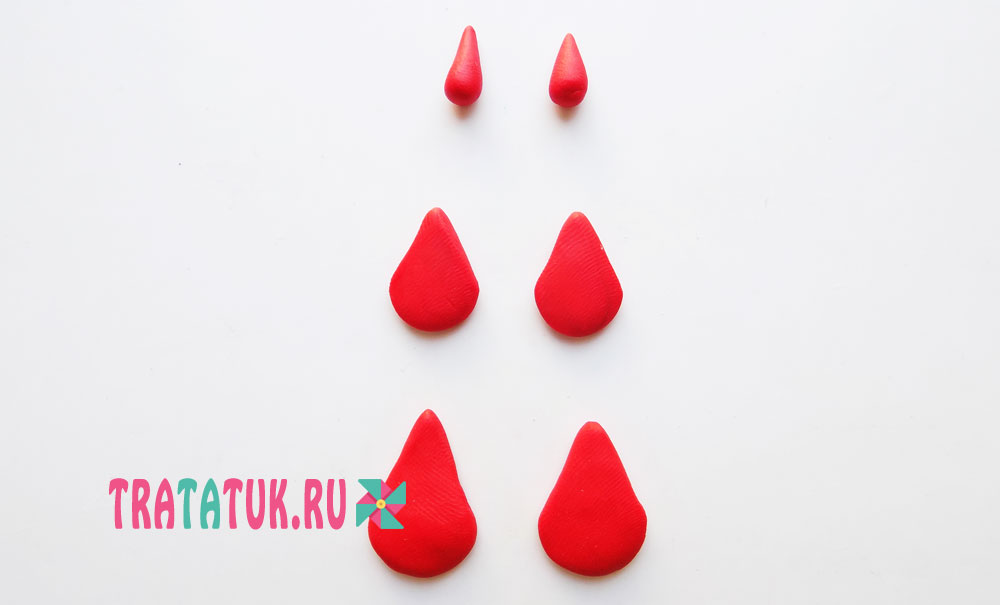 Из четырех из них мы сделаем плавники. Для этого шарики расплющиваем и придаем им каплеобразную форму. А самые маленькие шарики оставляем объемными в форме капелек. Они нужны для создания губ рыбки.
