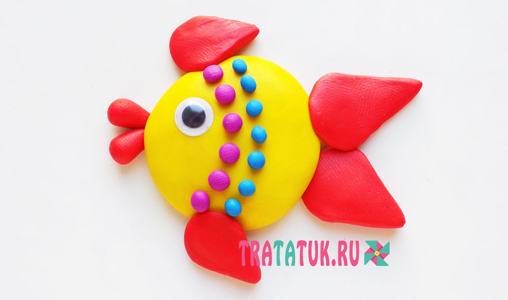 Таким способом заполняем желтую заготовку шариками другого цвета. Получилась вот такая яркая рыбка из пластилина.