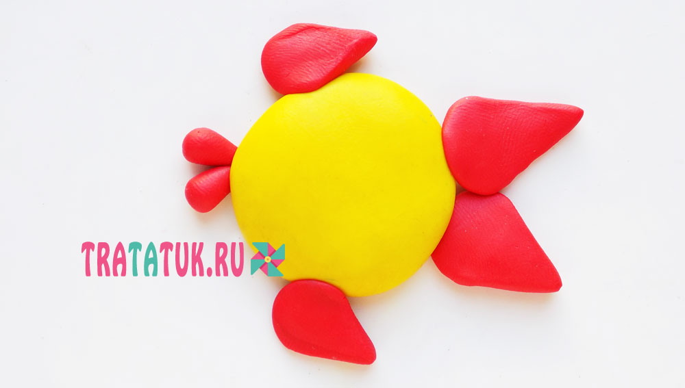 размазываем плавники. Для того чтобы сделать чешуйки у рыбы – отщипываем от оранжевого пластилина маленький кусочек