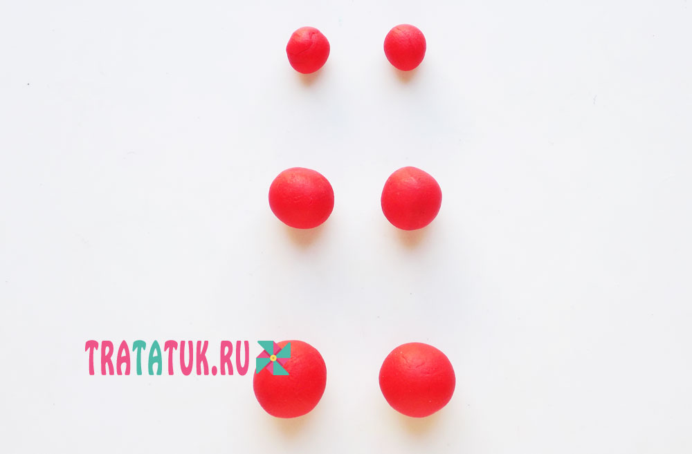 Теперь нам понадобится красный пластилин. Из него будем делать плавники и рот рыбки. Скатываем 6 шариков разного размера. При этом попарно они должным быть одинакового размера.