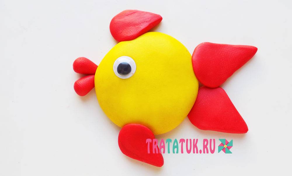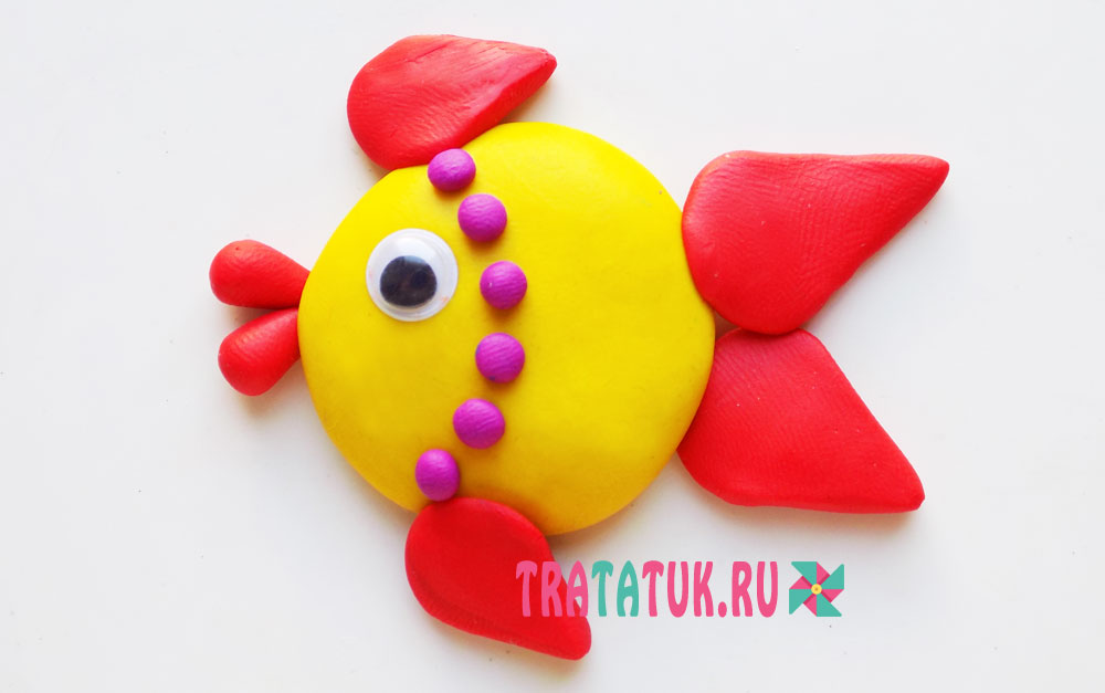 Берется пластилин. Из него раскатывается круг, примерно размером с голову рыбки. Получившийся шар слегка сплющивается. Далее берется другой пластилин, раскатывается, сплющивается и ножиком разрезается на три части, из которых делают плавники и хвост. С помощью расчески они украшаются отпечатками от зубьев. Далее получившиеся детали прикрепляются к голове рыбки. Затем раскатываются маленькие шарики, которые прикрепляются как губы. Крышечками делаются небольшие отпечатки жабр. Последний штрих – нарисовать чешуйки на теле получившегося изделия с помощью корпуса ручки. Вместо глаз прикрепляются бусинки. Рыбка из пластилина готова.