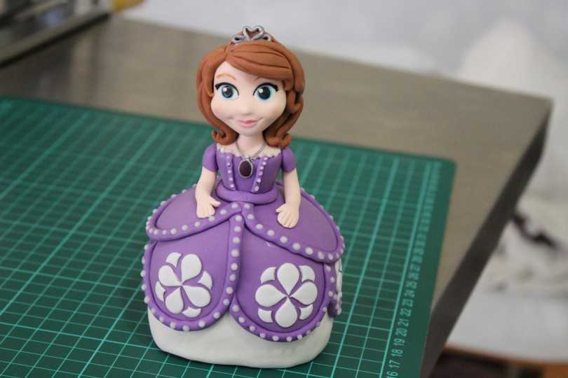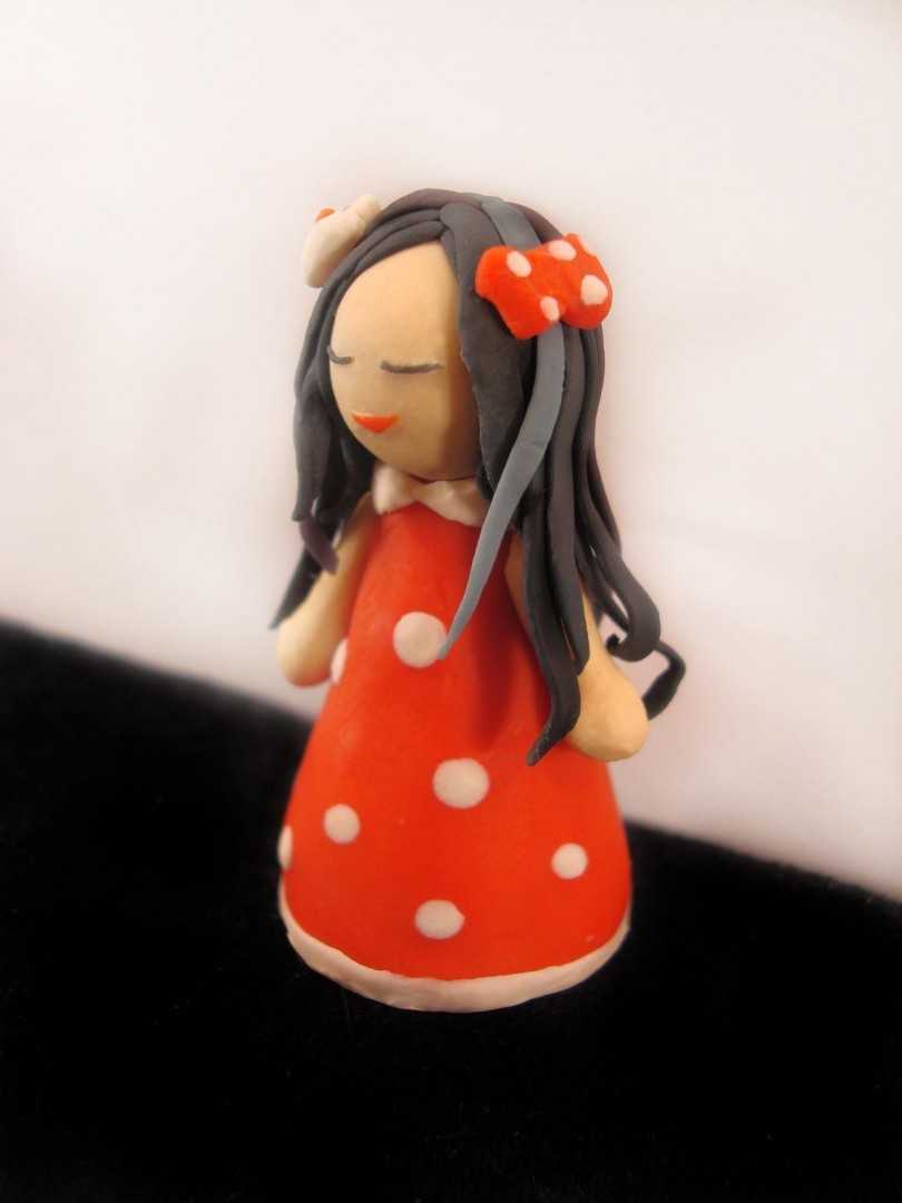 Нужно быть максимально аккуратным и хорошенько постараться, чтобы создать такую красавицу. Начинаем с бежевого овала. С одного края его следует заострить, выделить подбородок. Надавите аккуратно, создавая впадины для глаз. Создаем само личико: глаза, нос, рот. Из бирюзового бруска мастерим конус для юбки.