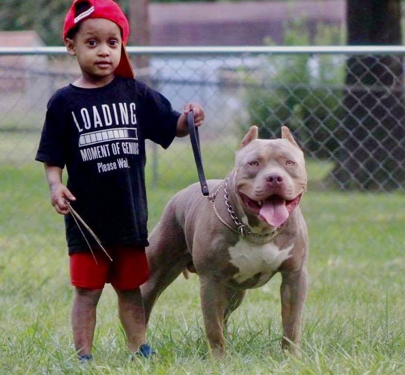 Эти животные одинаково любят как взрослых членов семьи, так и детей. Невольная грубость со стороны малыша псом не будет воспринята, так как у нее высокий болевой порог. С детворой играет с удовольствием. Малышей не кусают и даже огрызаются редко. Завидев играющих крох, впадают в детство, и с удовольствием принимают участие в веселье. Эти характеристики можно отнести только к породистым и чистокровным особям, которые были грамотно воспитаны. Несмотря на отсутствие агрессии к маленьким, родители должны объяснить чаду правила поведения с четвероногим. В процессе кормежки их беспокоить не рекомендуется. Если хочет уединиться, нужно ему это позволить. Отпугнуть воришку могут только внешним видом и при условии, что злоумышленник не знает об истинном нраве животного.