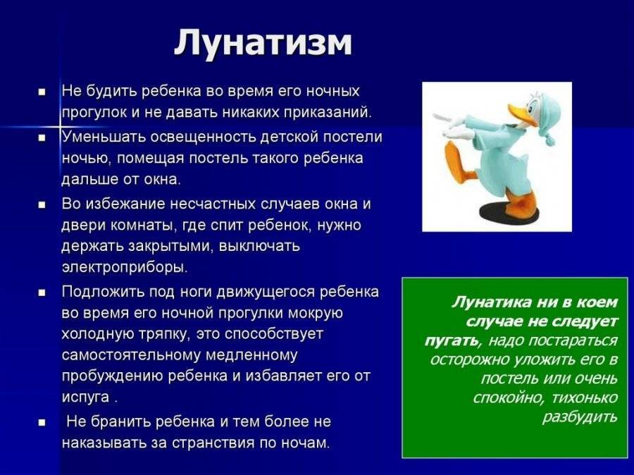 Советуют наблюдать за приступом лунатизма, чтобы вовремя оказать помощь. Бояться, что страдает психика ребенка при эпизодах лунатизма, не надо. Только тяжелые случаи парасомнии связаны с нарушениями детской психики. И тут лечение лунатизма проходит под контролем специалиста.