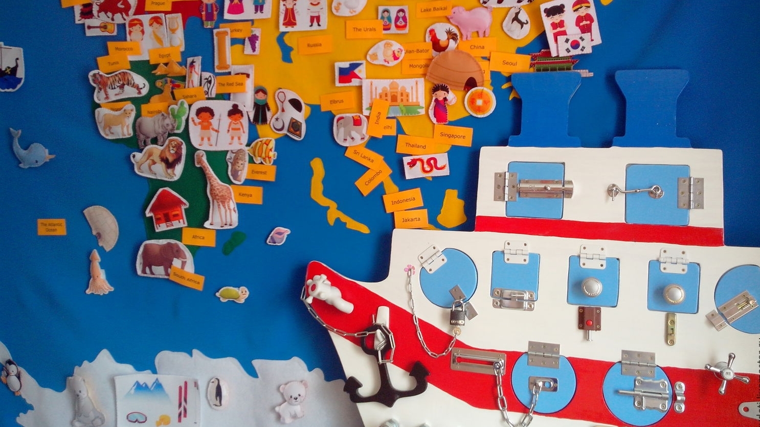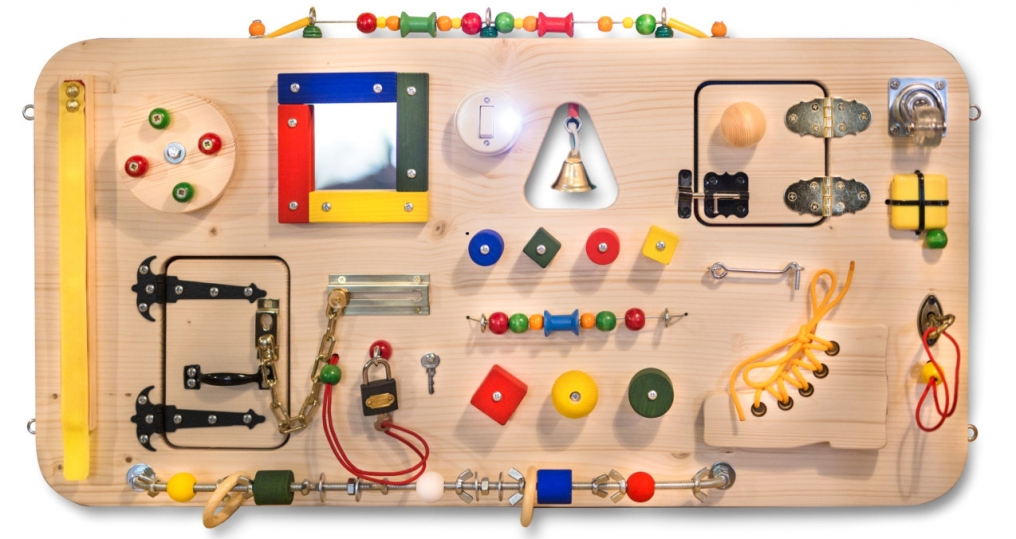 Можно снабдить доску открывающимися дверцами, запирающимися на настоящие навесные замочки с ключами или на крючок. Можно выдержать бизиборд в единой тематике, например, в морской: в качестве наполнения подойдет игрушечный штурвал, колокол, якорь, компас, кусочки канатов. Или – в автомобильной: закрепить руль, ненужный спидометр, зеркало заднего вида, болты, гаечные ключи и т.д.