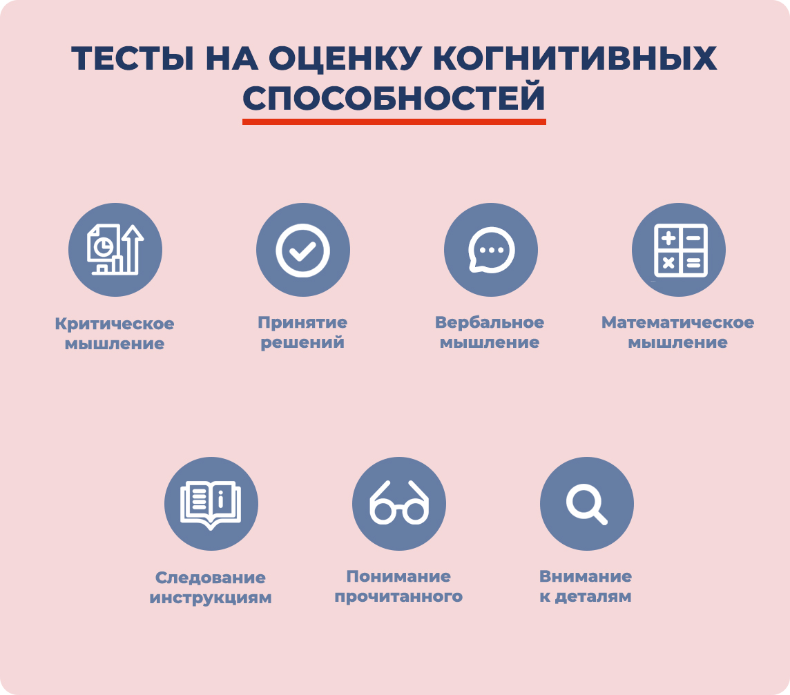 Тесты когнитивных способностей помогают оценить когнитивные и логические навыки кандидатов: критическое мышление, внимание к деталям или математическое мышление
