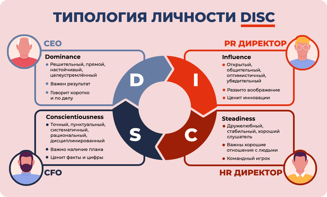 - DISC: основан на работе Уильяма Марстона, психолога, создавшего теорию DISC. В центре внимания четыре типа поведения: доминирование (D), влияние (I), устойчивость (S) и добросовестность (C).