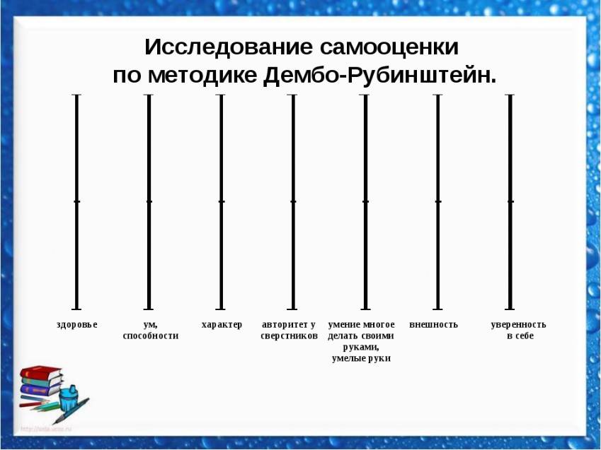 Методика диагностика самооценки Дембо-Рубинштейн в модификации А.М. Прихожан основана на непосредственном оценивании (шкалировании) школьниками ряда личных качеств, таких как здоровье, способности, характер и т.д.