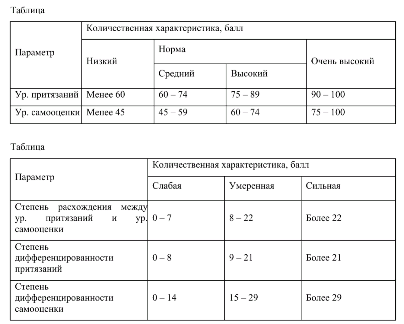 Реалистический уровень притязаний характеризует количество баллов от 60 до 90. Результат от 90 до 100 баллов обычно удостоверяет нереалистическое, некритическое отношение к собственным возможностям. Результат менее 60 баллов свидетельствует о заниженном уровне притязаний, свидетельствующий о неблагоприятном развитии личности.