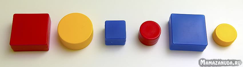 Выложите 5-7 фигур в ряд и предложите малышам выложить второй ряд так, чтобы под каждой фигурой оказалась фигура другого цвета (или формы, или размера).