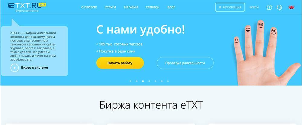 - ЕТХТ — лидер по числу заказчиков. Есть возможность написания текстов и продажи готовых статей в магазине. Кроме лояльного отношения к исполнителю, биржа имеет широкий функционал. Здесь можно проверять работу на уникальность, задать вопрос в службу поддержки сайта. Средства выводятся через электронные кошельки. Заявленный минимум — 250 рублей. Сроки вывода — до пяти суток. Если деньги нужны срочно, можно подать заявку и получить наличные в течение 24 часов. Правда, за дополнительную комиссию;