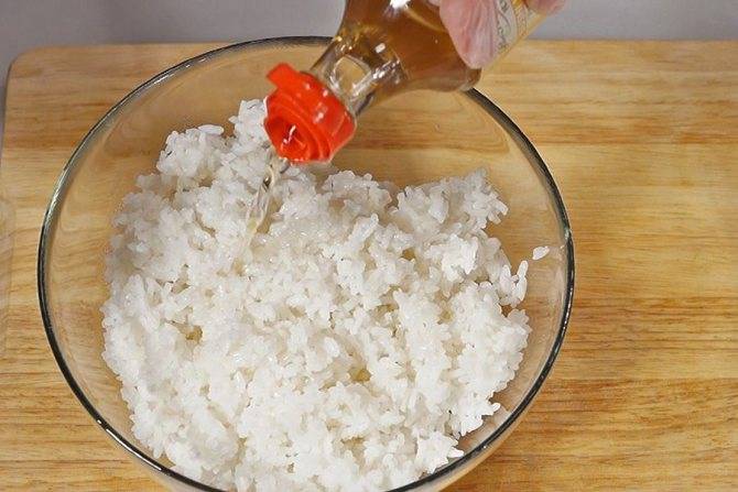 - Для начала нужно сварить рис, но готовится он не по стандартной технологии. Длиннозерновой рис следует промыть и залить водой в соотношении 1:1,5. В воду добавляем кусочек водоросли комбу, но достаем его до того, как вода начнет закипать. Когда вода закипит, накрываем крышку плотно и оставляем рис вариться на слабом огне, не более 20 минут, за это время вся вода выпарится. Через 20 минут огонь выключаем, но оставляем рис томиться на пару еще минут 10. А пока готовим соус – в 50 мл рисового уксуса следует растворить половину чайной ложки соли и половину столовой ложки сахара. В продаже можно встретить уже готовую заправку для риса. Поливаем горячий рис приготовленным раствором — главный ингредиент готов.