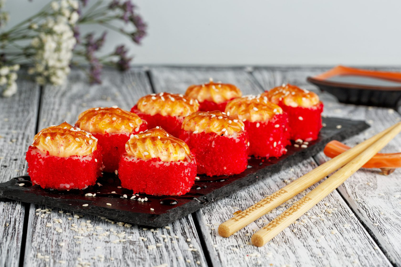Роллы украшают кунжутом или икрой тобико. Блюдо подается с острым соусом васаби, соевым соусом и маринованным имбирем. Если боитесь потреблять сырую рыбу при лактации, можно ее не добавлять, а использовать в качестве начинки только майонез, огурец и авокадо.