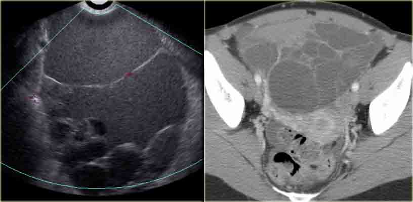 На УЗИ (слева) видно большое многокамерное кистозное образование в правом параметрии; некоторые из камер анэхогенны, в других визуализируются равномерные низкоуровневые эхогенные включения, обусловленные белковым содержимым (в данном случае муцином, однако аналогично могут выглядеть и кровоизлияния). Перегородки в образовании в основном тонкие. Кровотока в перегородках не выявлено, солидный компонент также отсутствует, признаков асцита не определяется. Несмотря на отсутствие кровотока при допплерографии и солидного компонента, размер и многокамерная структура этого образования позволяют заподозрить кистозную опухоль и порекомендовать другие, более точные методы диагностики. На КТ с контрастным усилением (справа) определяются схожие изменения. Камеры образования имеют различную плотность, соотносящуюся с разным содержанием белка. При гистопатологическом исследовании подтвердилась муцинозная цистаденокарцинома с низким потенциалом злокачественности.