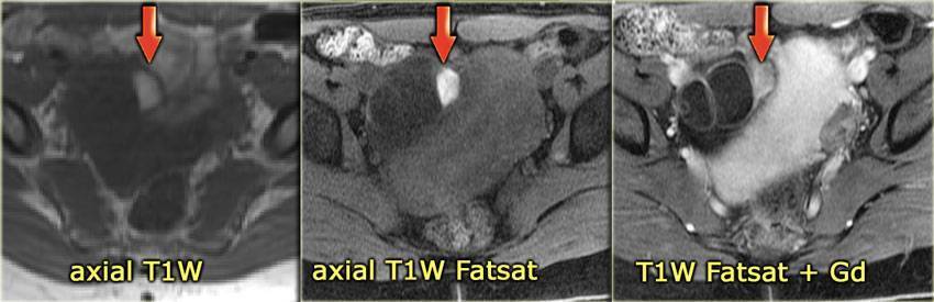 На МРТ геморрагическое содержимое внутри эндометриомы приводит к повышению интенсивности сигнала на Т1 ВИ. На Т1 ВИ с жироподавлением эндометриома остается гиперинтенсивной в отличие от тератом, которые также гиперинтенсивны на Т1 ВИ, но гипоинтенсивны на Т1 FS. Эта последовательность (Т1 FS) всегда должна дополнять МР-исследование, поскольку позволяет обнаружить мелкие очаги, гиперинтенсивные на Т1.