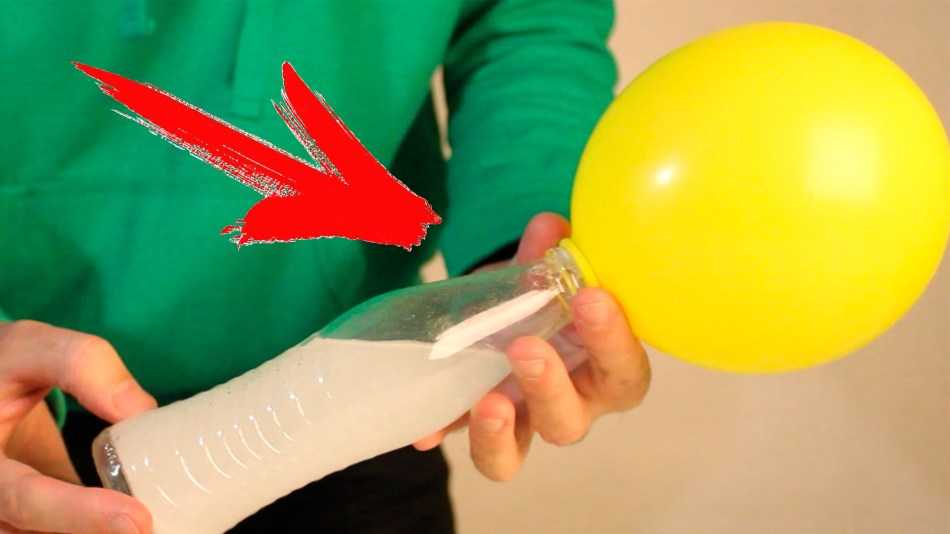 - Шарики. Необходимо взять несколько бутылок и срезать с них верхушки, примерно на 5 см. В результате у вас получится своеобразная воронка. На горлышко бутылки необходимо надеть шарик и проделать это с остальными горлышками. В получившуюся воронку необходимо всыпать по чайной ложке обычного гидрокарбоната натрия. То есть пищевой соды. В бутылки необходимо набрать немного воды и добавить примерно столовую ложку уксуса. Также желательно добавить красителей. Это сделает опыт более ярким. Теперь необходимо очень аккуратно, зажимая соду в шарике, надеть воронки на бутылки. Плавными движениями необходимо засыпать соду в бутылку. Не забывайте плотно прижимать воронку к бутылке, чтобы углекислый газ не выходил через щели. В результате химической реакции соды и уксуса выделяется большое количество углекислого газа, который заполняет шарики, надувая их.