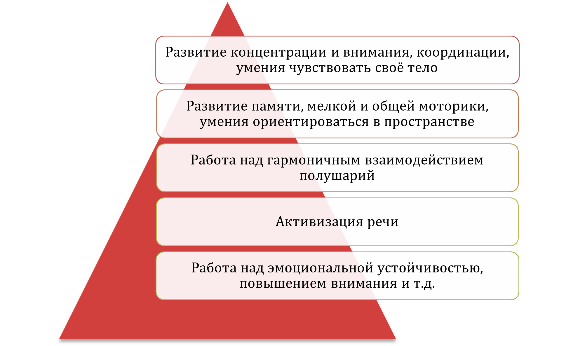Через управление своим телом и своими движениями, а через также овладение когнитивными функциями ребенок получает возможность преодолеть неадаптивные особенности своего развития, трудности в школьном обучении, трудности саморегуляции и детские поведенческие проблемы.