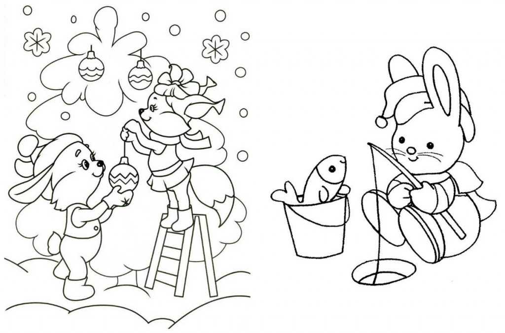 Лесные жители тоже празднуют Новый год. Белочка с зайчиком уже украшают елку. Второй зайка ловит рыбу в шапочке, ведь нельзя в мороз ходить без головного убора.