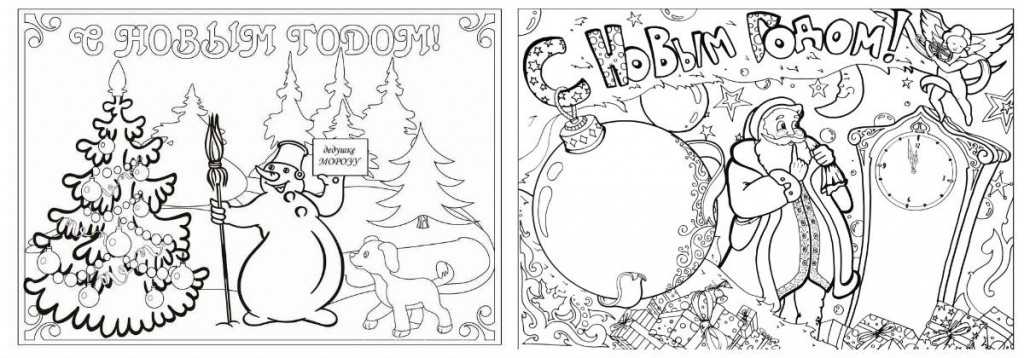 Новогодняя открытка не обязательно должна быть с Дедом Морозом, Снегурочкой и елкой. Хотя вышеописанные инструкции помогут нарисовать таковые без труда. Новогоднюю открытку можно сделать с любым зимним сюжетом. Особенно такой подарок, сделанный детскими руками, придется по душе родителям и бабушке с дедушкой. Предлагаем два варианта новогодних открыток разной тематики.