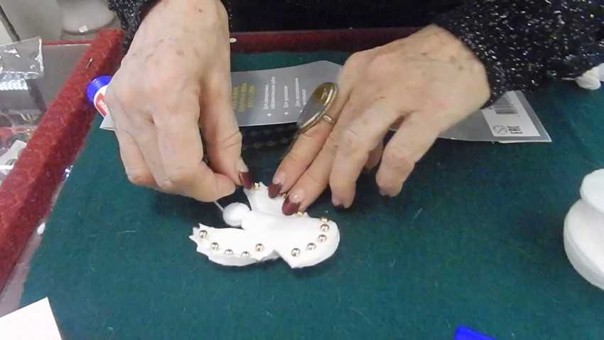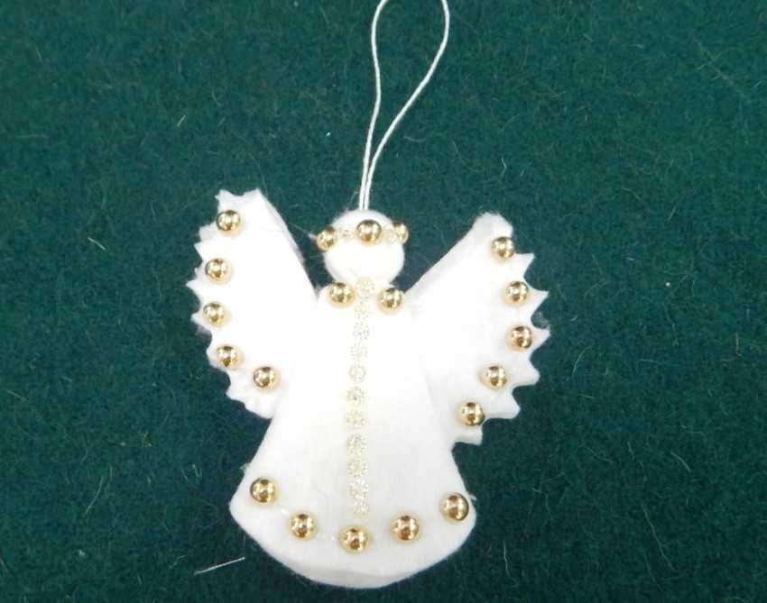 К головке приклеиваем нимб из маленьких бусин, также бусинками украшаем крылышки и одежду.