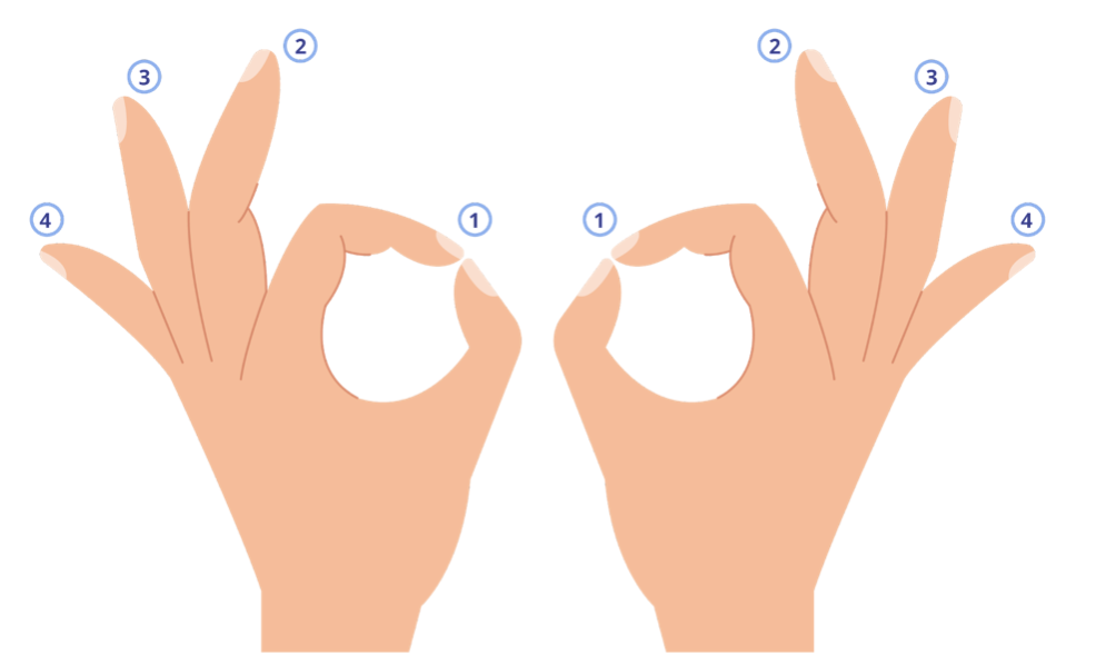 Большой палец поочерёдно соединяется в кольцо с указательным, средним, безымянным и мизинцем с постепенно возрастающей скоростью. Нужно делать как в прямом порядке — от указательного к мизинцу, так и в обратном. Сначала каждой рукой по отдельности, затем вместе.
