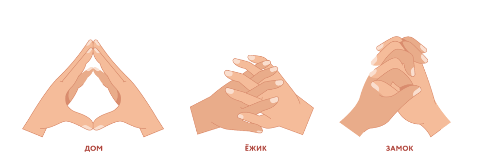 «Ёжик» — ладони располагаются под углом, пальцы одной руки проходят между пальцами другой.