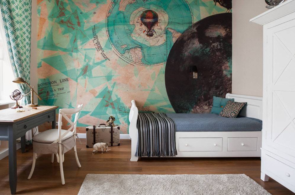 Расширяется круг общения, появляются новые интересы, которые могут найти свое отражение в оформлении комнаты. Например, на потолок можно наклеить обои с изображением карты звездного неба, а одну из стен превратить в карту мира.