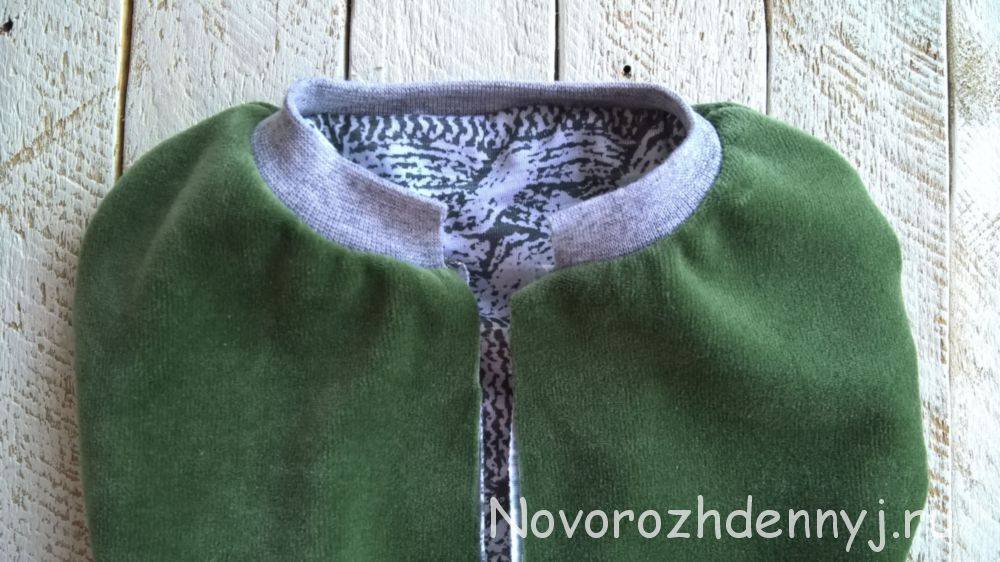 Сначала обшивается воротничок. Затем молния пришивается к кокону. После этого передние половинки с молнией сшиваются по бокам с задней частью кокона.