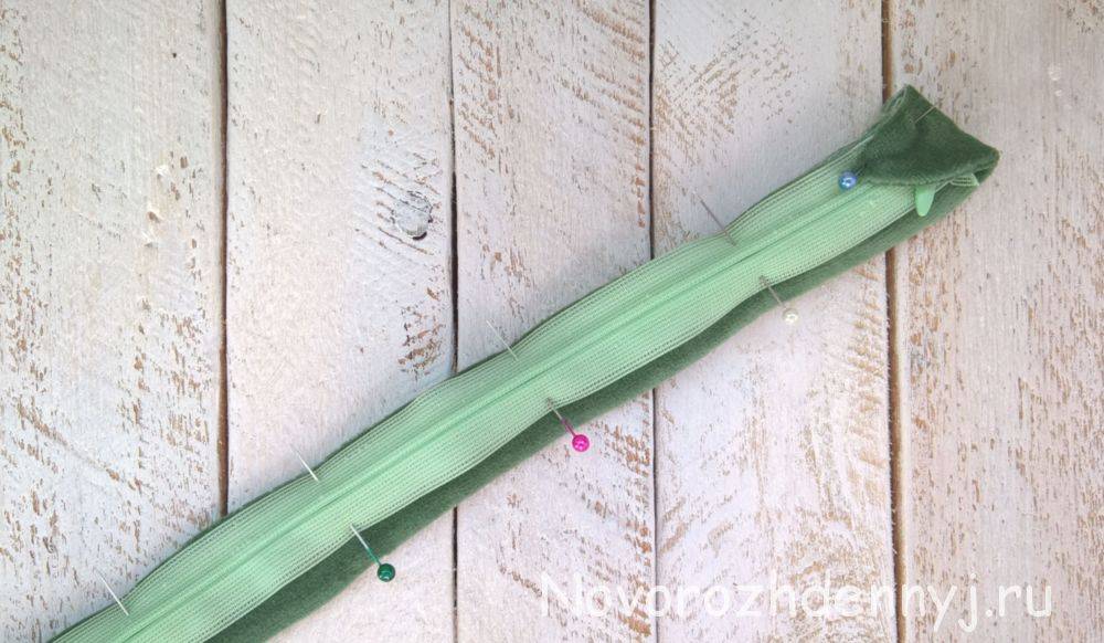 - Верхний закругленный край планки послужит защитой от верха молнии, поэтому его нужно будет завернуть, окутав молнию. Сделав это, зафиксируйте верх молнии и верх планки булавкой, а затем прикрепите булавками молнию к планке по всей длине.