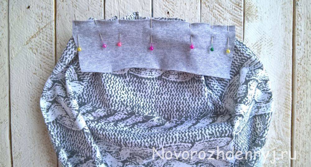 - К подкладочному вырезу горловины (от одной полочки через спинку к другой полочке) приложите деталь из рибаны, разместив обе ткани лицевыми сторонами друг к другу. Немного растягивая горловину из рибаны, зафиксируйте ее на подкладке булавками.