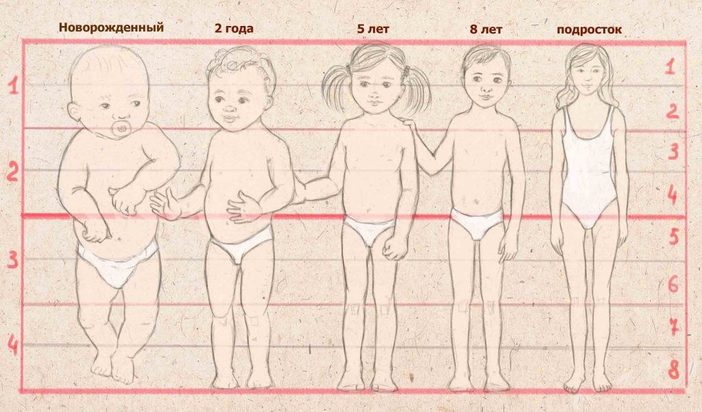 Части тела растут неравномерно, и, как следствие, соотношение между ними все время меняется. Их длина с момента рождения до завершения формирования увеличивается следующим образом: