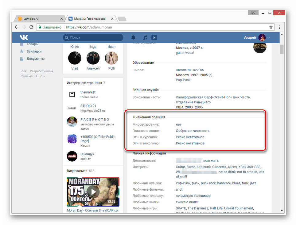 Заполняя строки на странице «Жизненная позиция», лучше всего использовать существующие термины, упрощая окружающим понимание ваших взглядов на жизнь.