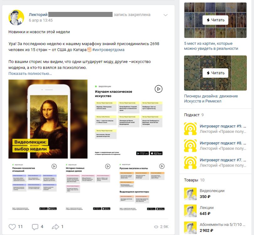 Смотрите, все товары вынесены в правую панель, потому что их слишком много. А прямо перед нами закрепленный пост с актуалочкой: видеолекцииями на период карантина