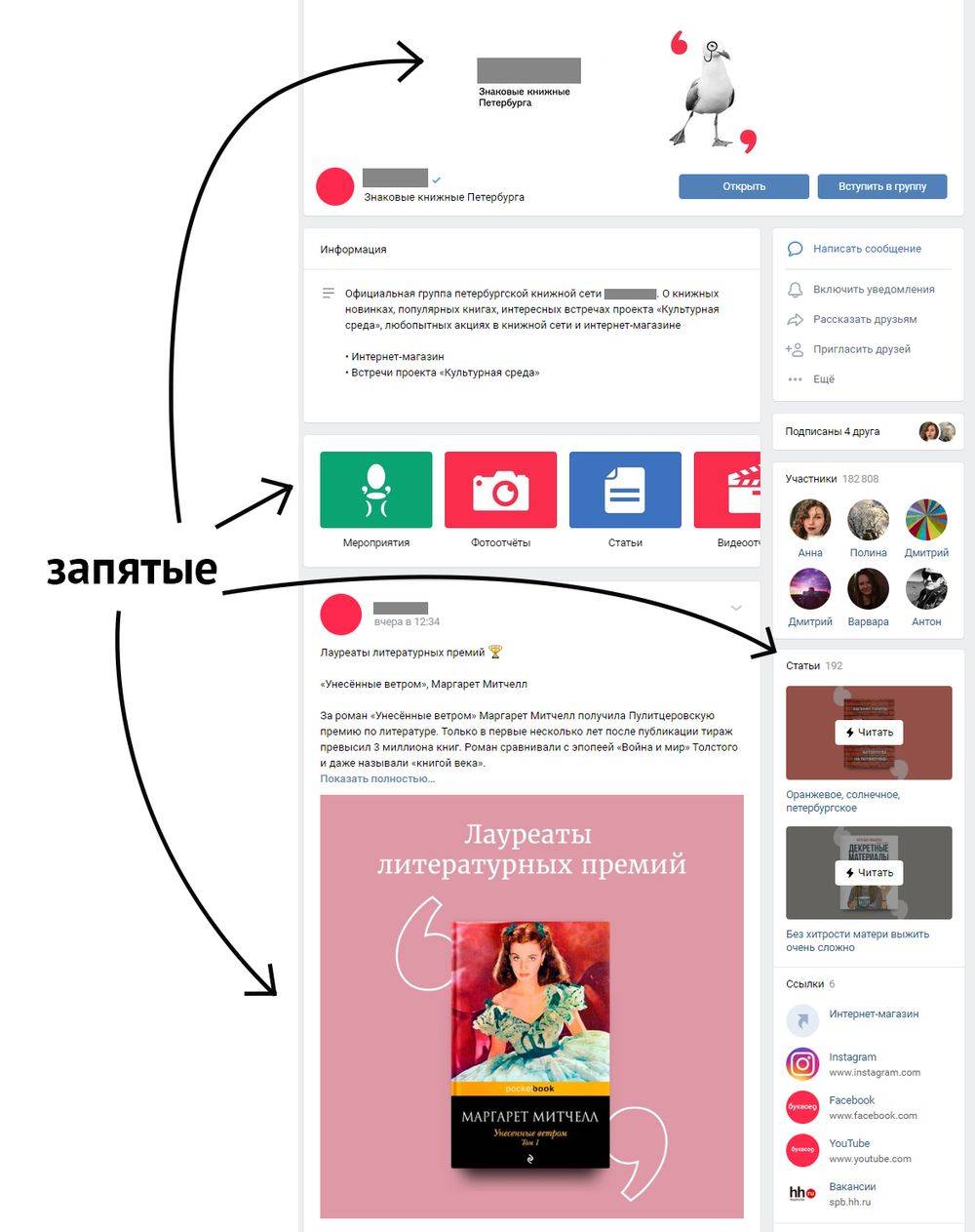 Здесь повсюду запятые! Они мелкие и ненавязчивые, поэтому сообщество смотрится лаконично. В то же время фирменные элементы невозможно не заметить