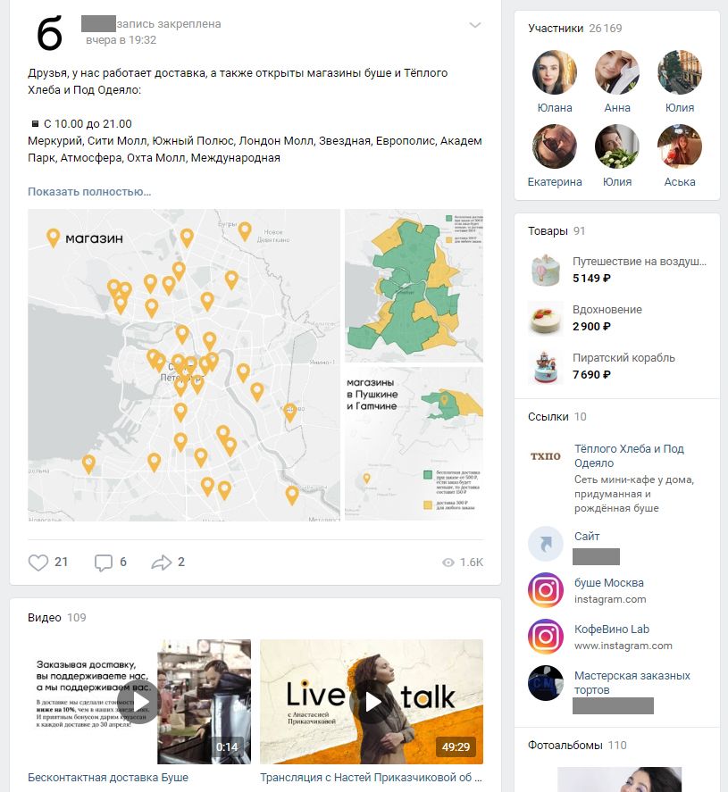 В закрепленном посте новости о службе доставки и адресах, товары вынесены вверх на правой панели. Эти два блока можно охватить одним взглядом: нашел магазин в своем районе и переходишь к выбору вкусностей. А дальше на главную панель вынесены видео – если на них сделана ставка в продвижении, они гораздо важнее, чем всякие виджеты и меню