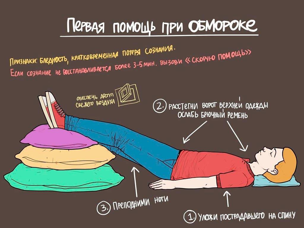 Первая помощь при обмороке заключается в проведении следующих мероприятий: