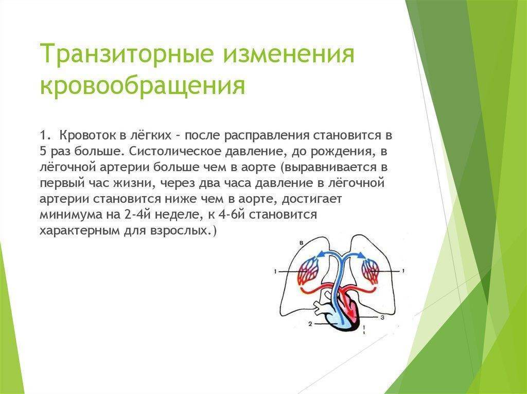 Эти частичные коммуникации между отделами сердца предназначены для снижения нагрузки на миокард и сосуды легких, они дают возможность ребенку приспособиться к новому типу кровообращения. Особенностями переходного периода является возможность возникновения таких симптомов: