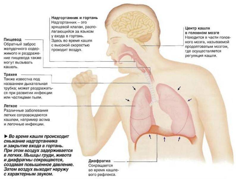 Кашель – спастическое неоднократное сокращение мышц, связанных с дыхательным трактом. Природное назначение такого рефлекса, возникающего чаще всего в ответ на раздражение ЛОР-органов и структур дыхательной системы, заключается в форсированном очищении просвета воздухоносных путей. Различают кашель сухой (непродуктивный) и влажный (продуктивный, в просторечье «мокрый», «отхаркивающий», т.е. сопровождаемый отделением слизистых масс).