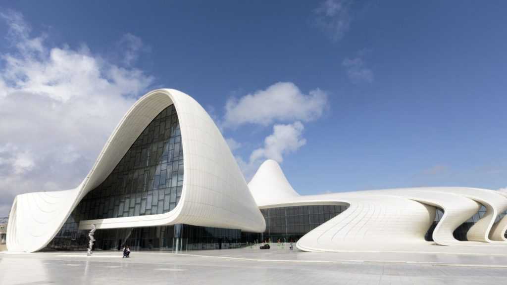 Культурный центр Гейдара Алиева в Азербайджане по проекту Захи Хадид в 2007 году. Здание признано лучшим в мире по версии Design of the Year в 2014 году.